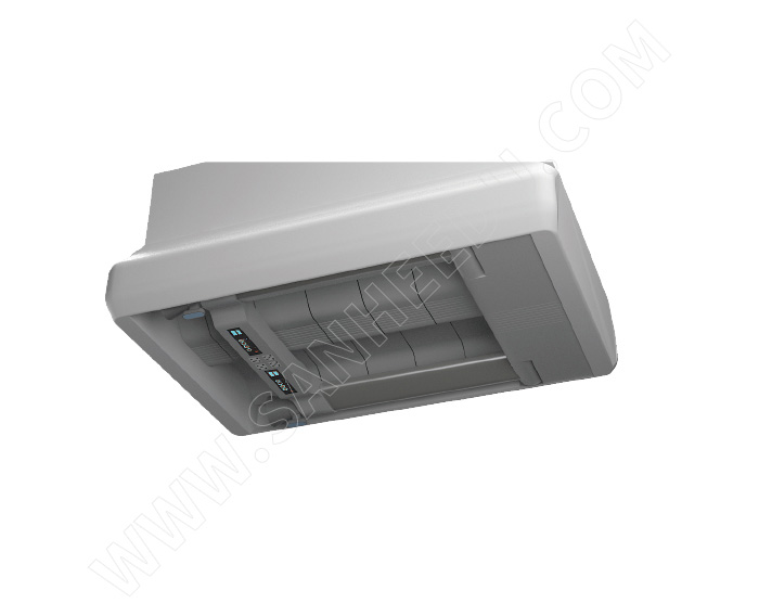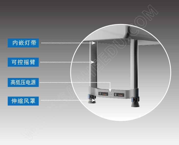 摇臂构架收起时完全收入主体构架内,解放区域空间,保持视野通畅;放下时向下旋转90度,使摇臂终端接近实验桌台面。